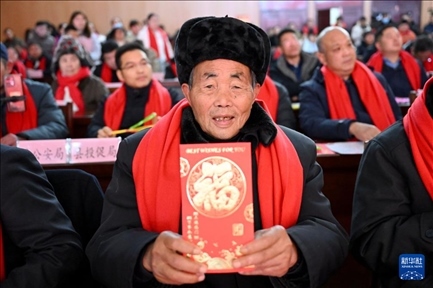 2月1日,在鳳陽縣小崗村,“大包干”帶頭人嚴金昌展示自家領取的分紅紅包。新華社記者 黃博涵 攝