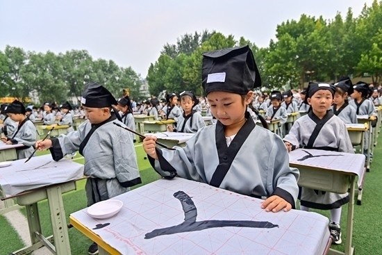 2023年9月1日,山東濰坊,青州市云門(mén)山路回民小學(xué),一年級(jí)新生用毛筆書(shū)寫(xiě)“人”字。視覺(jué)中國(guó)供圖