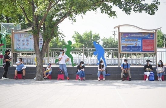 2021年6月12日,北京豐臺(tái)二中附屬看丹小學(xué)門(mén)外,陸續(xù)有家長(zhǎng)帶著相關(guān)材料排隊(duì)等待9點(diǎn)準(zhǔn)時(shí)開(kāi)啟的入學(xué)信息審核。視覺(jué)中國(guó)供圖