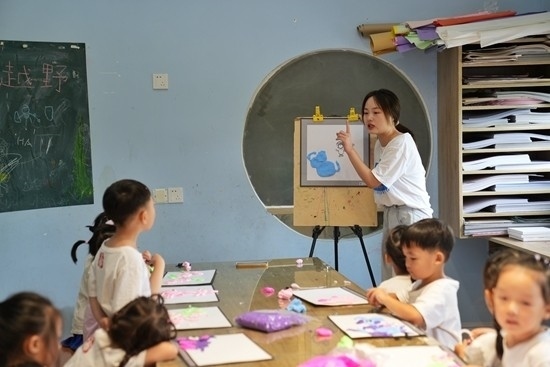 2022年7月21日,江西一幼兒園里的孩子在老師的指導(dǎo)下練習(xí)繪畫(huà)。視覺(jué)中國(guó)供圖
