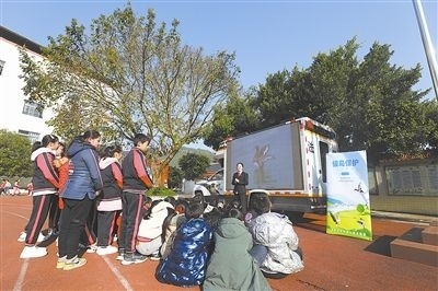 干警利用“車載便民法庭”播放宣傳片,教孩子們認(rèn)識(shí)棲息在當(dāng)?shù)氐恼滟F候鳥。