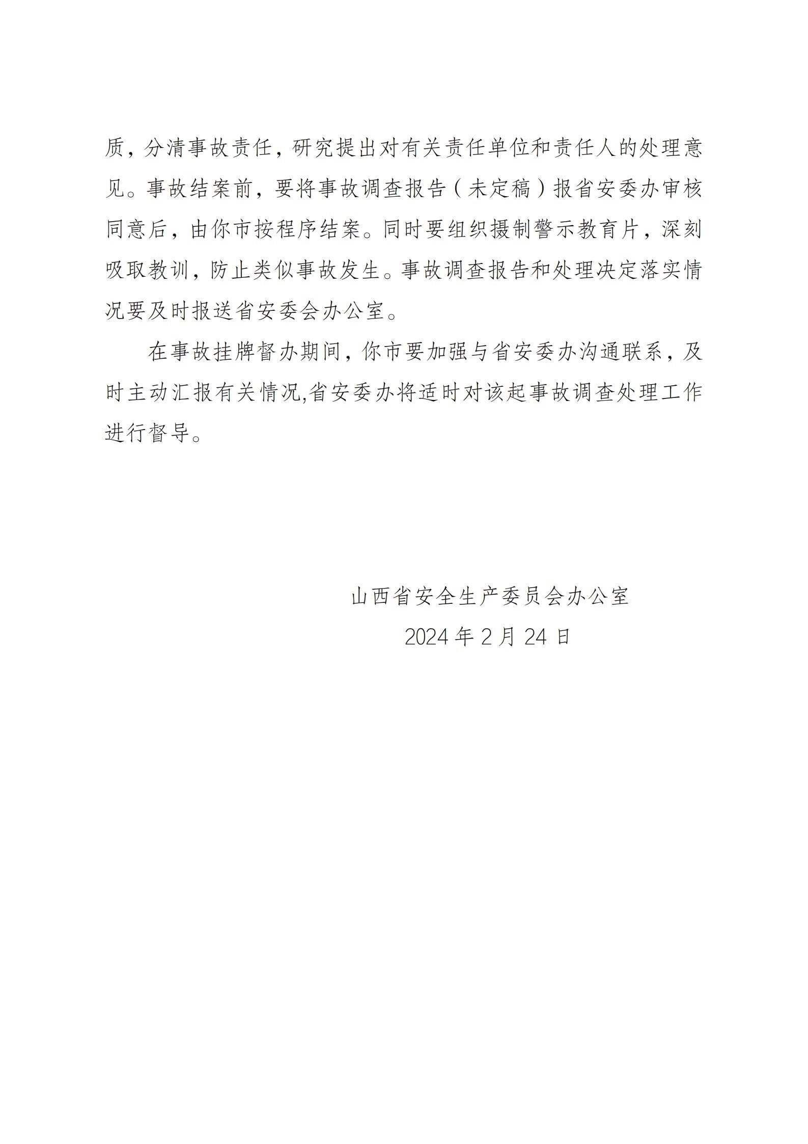 根據(jù)《國務(wù)院關(guān)于進(jìn)一步加強(qiáng)企業(yè)安全生產(chǎn)工作的通知》《山西省較大事故查處掛牌督辦辦法》等有關(guān)規(guī)定要求,山西省安委辦決定對該起事故查處實行掛牌督辦。要求呂梁市依據(jù)有關(guān)法律法規(guī)和規(guī)定,組織進(jìn)行事故調(diào)查,查明事故原因,認(rèn)定事故性質(zhì),分清事故責(zé)任,研究提出對有關(guān)責(zé)任單位和責(zé)任人的處理意見。事故結(jié)案前,要將事故調(diào)查報告報山西省安委辦審核同意后,由呂梁市按程序結(jié)案。同時要組織攝制警示教育片,深刻吸取教訓(xùn),防止類似事故發(fā)生。事故調(diào)查報告和處理決定落實情況要及時報送山西省安委辦。