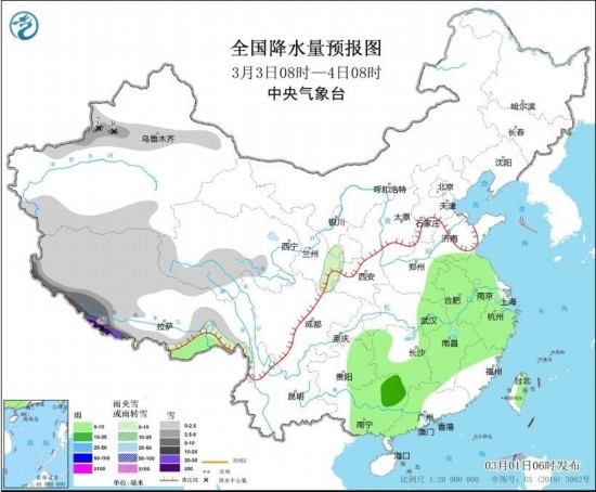 3月3日08時至4日08時,新疆伊犁河谷、西藏南部和西部等地部分地區(qū)有中到大雪,其中,西藏南部部分地區(qū)有暴雪到大暴雪,局地特大暴雪(30~40毫米)。黃淮西部、江淮、江漢東部、江南大部、西南地區(qū)東南部、華南大部等地部分地區(qū)有小到中雨。