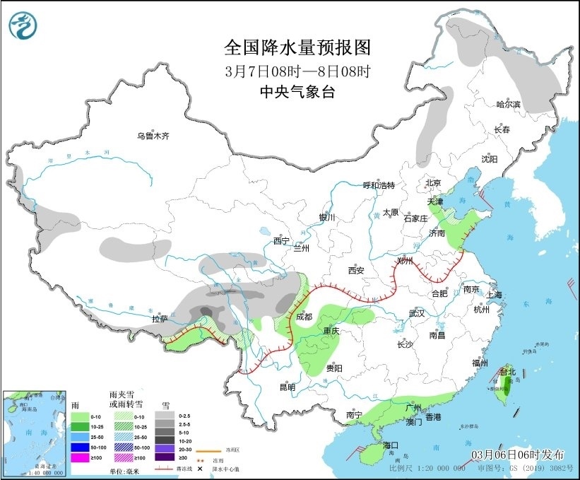 圖1 全國降水量預報圖(3月6日08時-7日08時)