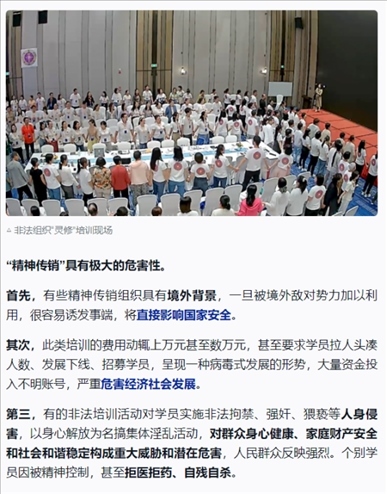 ·起底被公安機關(guān)打擊查處的“靈修”組織:打著“靈修”“靈魂塑造”等旗號,對學(xué)員實施精神控制;借“靈修”提升之名,行“精神傳銷”之實。鄧海鵬及其創(chuàng)辦的培訓(xùn)機構(gòu),打著“靈魂塑造”“集體場域”的幌子,對學(xué)員進(jìn)行精神控制,然后以傳銷、加盟、進(jìn)階等現(xiàn)代營銷模式達(dá)到斂財漁色目的。人前他要求學(xué)員全部吃素,自己每天大魚大肉,必吃海參;人前他要求學(xué)員不能有不動產(chǎn)、錢是修行來的,自己卻拿著騙來的錢去買理財產(chǎn)品;人前他無兒無女,實則有妻有女;人前假裝不近女色,背地里卻漁色女學(xué)員。