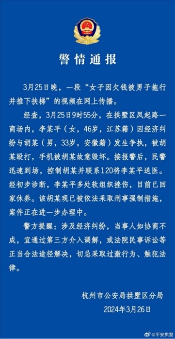 ·杭州拱墅警方通報女子被拖行推下扶梯:因經(jīng)濟糾紛起爭執(zhí),男子被依法采取刑事強制措施。