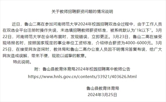 ·河南官方通報:高中教師招聘薪資1000以下系操作失誤。