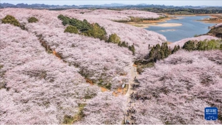 近日,貴州省貴安新區(qū)櫻花園內(nèi)的2.4萬畝櫻花迎來盛花期,花團(tuán)錦簇,春意盎然,吸引各地游客前來賞花游玩。?