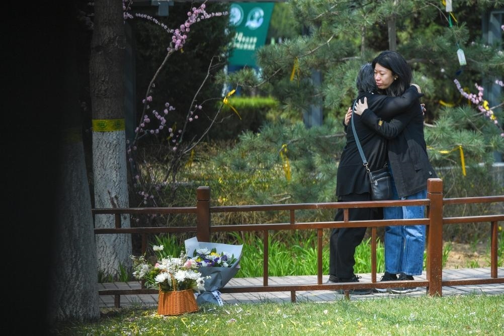 4月2日,在北京長(zhǎng)青生命紀(jì)念園自然葬區(qū),自然葬逝者家屬在安放花束、祭奠親人后相擁。新華社記者 鞠煥宗 攝