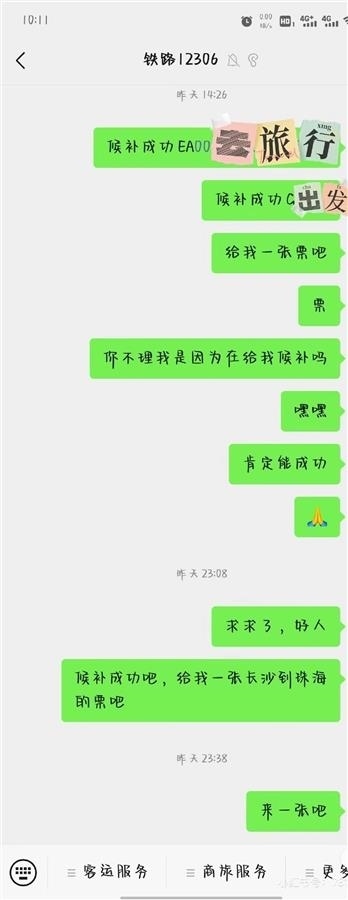 “你不理我是因?yàn)樵诮o我候補(bǔ)嗎”“親愛(ài)的我要票”……另一名網(wǎng)友也發(fā)帖稱(chēng),自己使用向12306微信公眾號(hào)“發(fā)瘋”的辦法,成功候補(bǔ)到了車(chē)票,其發(fā)布的網(wǎng)帖題為“適當(dāng)發(fā)瘋候補(bǔ)成功”。
