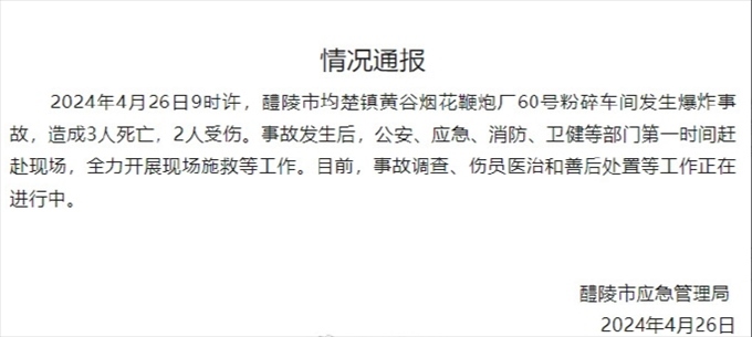 ·湖南醴陵市一煙花鞭炮廠車(chē)間發(fā)生爆炸事故,致3死2傷。