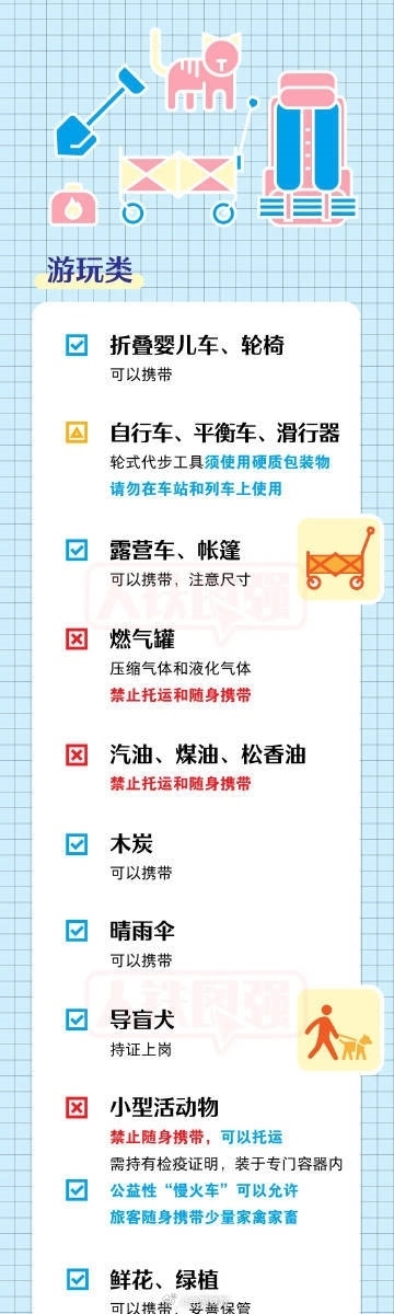 坐火車出游的小伙伴請注意!有些物品過不了安檢,出發(fā)前趕快篩查行李單,隨手轉(zhuǎn)發(fā)?、侔b密封完好、標志清晰且酒精體積百分含量大于或者等于24%、小于或者等于70%的酒類飲品累計不超過3000毫升。②充電寶標志清晰,單塊額定能量不超過100Wh。③自噴壓力容器,單體容器容積不超過150毫升,每種限帶1件,累計不超過600毫升。④含易燃成分的非自噴壓力容器日用品,單體容器容積不超過100毫升,每種限帶1件。
