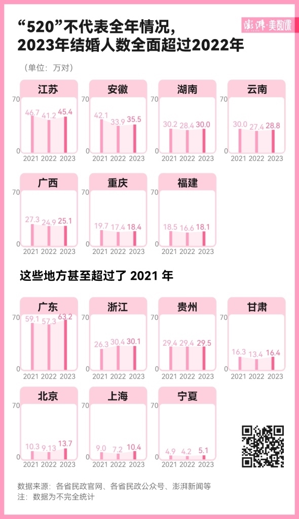 2023 年多地“520”領(lǐng)證人數(shù)下跌,引起熱議。2024 年的“520”剛剛過去,多地披露了當(dāng)日結(jié)婚登記數(shù)。廣東、安徽、江蘇等省當(dāng)日領(lǐng)證人數(shù)較去年有回升。澎湃新聞從深圳市民政局獲悉,截至 5 月 20 日 18 時(shí) 30 分,“520”全天共辦理結(jié)婚登記 1851 對(duì),單日辦理量為近 5 年以來最高。中國人又重燃對(duì)婚姻的渴望了嗎?