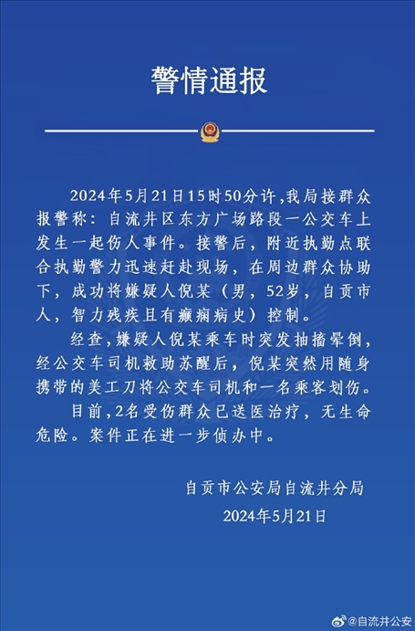 ·四川自貢警方通報(bào)“一男子在公交車上用美工刀劃傷司機(jī)和乘客”:男子智力殘疾且患有癲癇病史。