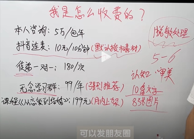 此外,不少婚戀軍師都公開了聯(lián)系方式,通過提供一對一指導(dǎo)、付費(fèi)視頻、情感課程、收徒、經(jīng)營朋友圈教學(xué)等形式斂金,且價(jià)格不菲。