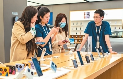 圖為上海華為一家線下門店內(nèi),消費(fèi)者在體驗(yàn)華為Pura70系列手機(jī)。王 初攝(人民視覺)