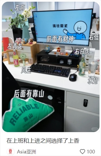 有網(wǎng)友分享工位的風水大有講究:擺滿綠植象征欣欣向榮,整體布置左高右低;后背有靠,面不對門;左靠窗,水杯放左邊,寓意風生水起;雜物放桌面左邊,右邊越簡約越好。