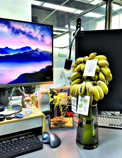 “現(xiàn)在大家工作都挺累的,職場里稍微有一點令人感到驚喜和有趣的話題,大家好像就會變得很開心。”吳圳是一名桌搭博主,自從他開始在辦公桌上養(yǎng)香蕉之后,單位的很多同事都會好奇地走過來瞧瞧。