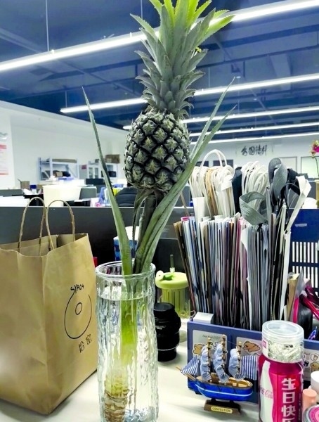 00后楊三日從事新媒體運營工作,她在工位上養(yǎng)了一個菠蘿,“養(yǎng)菠蘿是一件很酷的事情,不僅能觀賞,還能吃,很配我特立獨行的氣質(zhì)?!彼f自從養(yǎng)了菠蘿之后,每天上班時心情就變得非常好?!拔业墓の痪拖駸釒в炅忠粯樱崆斑M入了春天。”