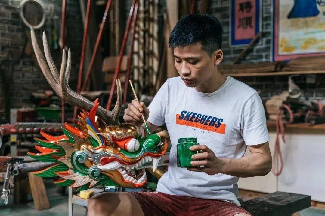 那兩年,張偉潮身邊做龍頭的老匠人們或退休,或轉(zhuǎn)行,是最愁無(wú)人接班的時(shí)候。在沒人支持的落寞下,張偉潮迎頭撞進(jìn)了這個(gè)行當(dāng)。那是2010年,很快到來(lái)的,是龍舟的流行。