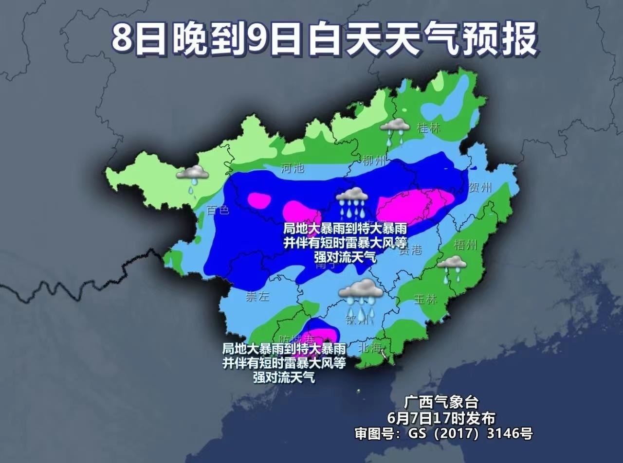 8日晚上到9日白天,雨勢升級,并進入此輪降雨的最強階段,強降雨的范圍也將進一步擴大,廣西全區(qū)有大雨到暴雨,局地有大暴雨到特大暴雨,并伴有短時雷暴大風(fēng)等強對流天氣。