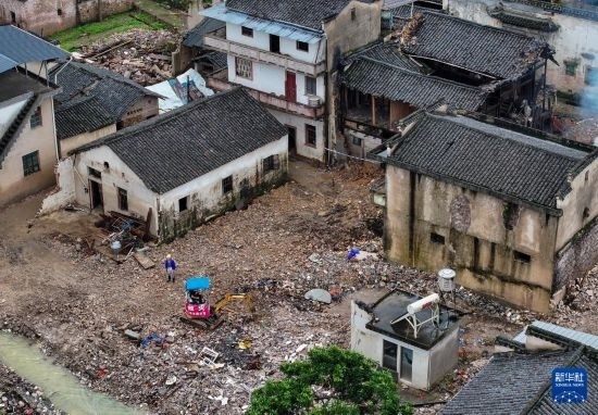 6月28日,工作人員在黃山市歙縣溪頭鎮(zhèn)進(jìn)行災(zāi)后清理工作(無人機(jī)照片)。
