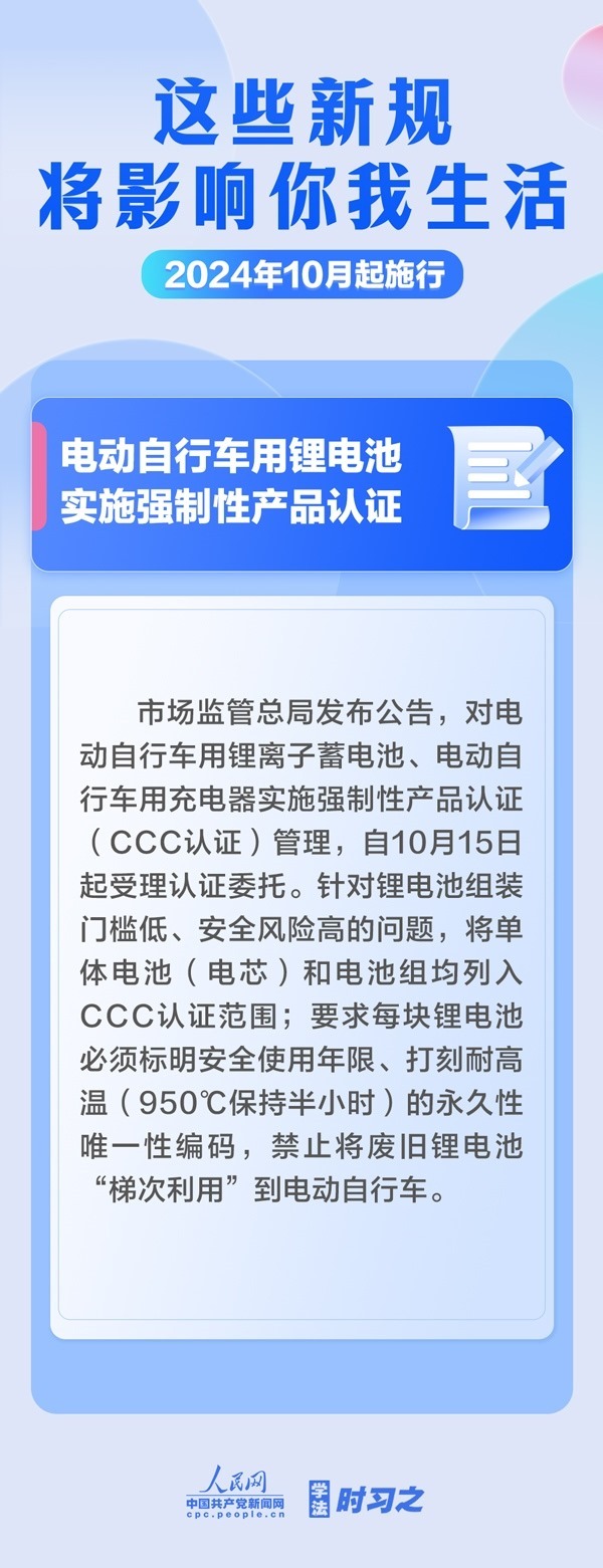 增加軍人撫恤優(yōu)待措施;全鏈條規(guī)范養(yǎng)老機構收費行為;電動自行車用鋰電池實施強制性產(chǎn)品認證……10月起,這些新規(guī)施行,將影響你我生活。