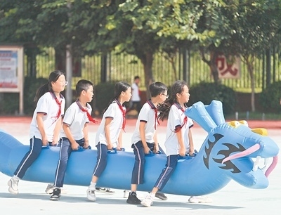 近年來,廣西梧州將大象拔河、竹竿舞、打陀螺等民族體育項目引進課堂,讓學(xué)生在享受運動快樂的同時,接受民族團結(jié)進步教育。圖為近日當?shù)匾凰W(xué)的學(xué)生體驗“旱地龍舟”。