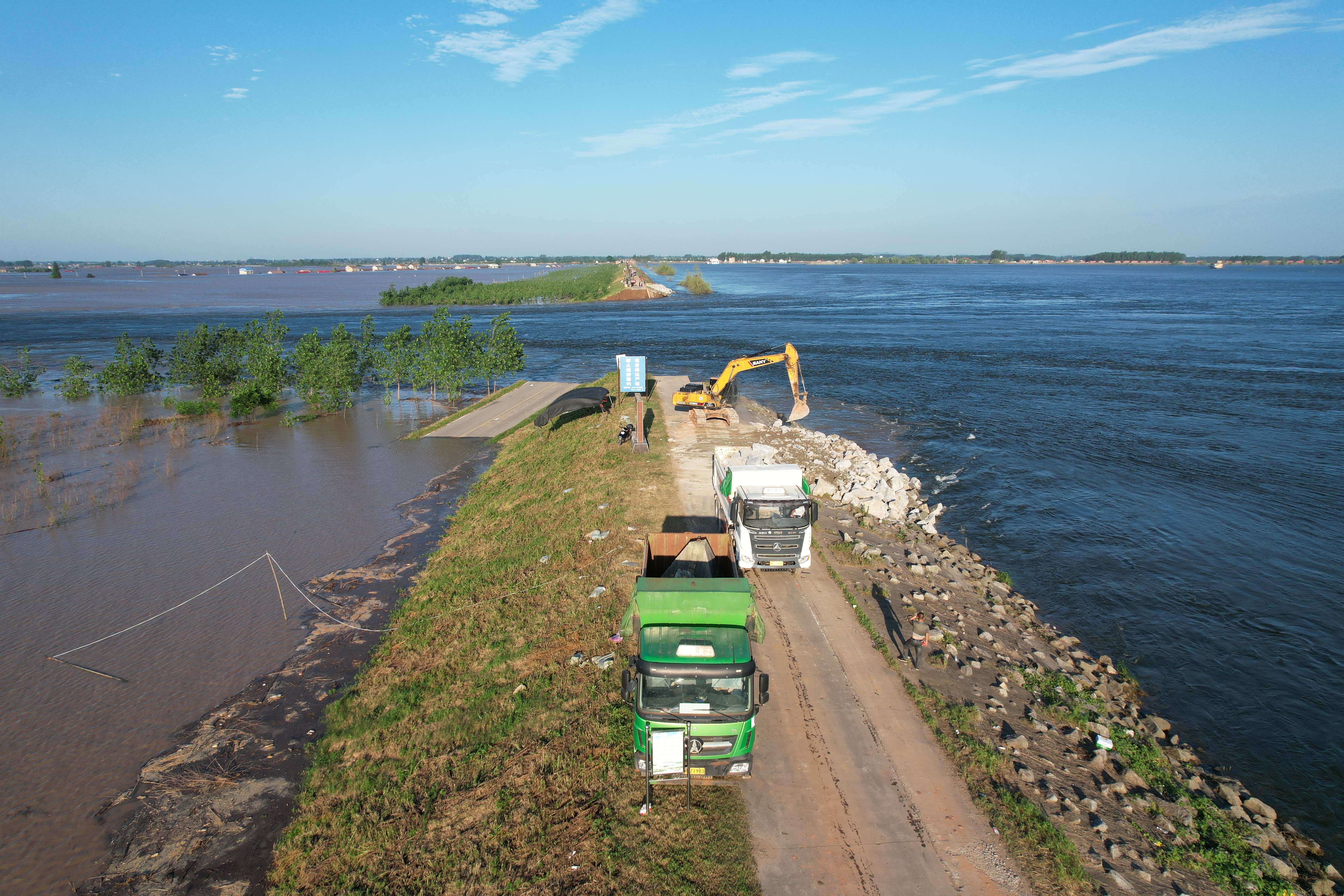 目前,前線正加緊組織工程機械加緊施工,在決口兩端建設(shè)4個倒車平臺,并在決口兩端傾倒大型石塊,建設(shè)‘裹頭’,減緩水流對決口沖刷,防止決口擴大。