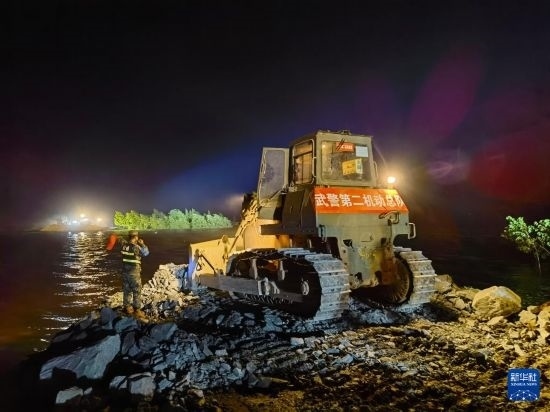 7月7日凌晨,在湖南省岳陽市華容縣團(tuán)洲垸洞庭湖一線堤防決口處,武警部隊(duì)官兵操縱工程機(jī)械封堵決口。