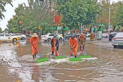 7月26日,遼寧省氣象局發(fā)布暴雨橙色預(yù)警。受強降水影響,遼寧有11個市啟動了防汛應(yīng)急響應(yīng)。圖為26日環(huán)衛(wèi)工人在沈陽市街頭清除積水。新華社發(fā)