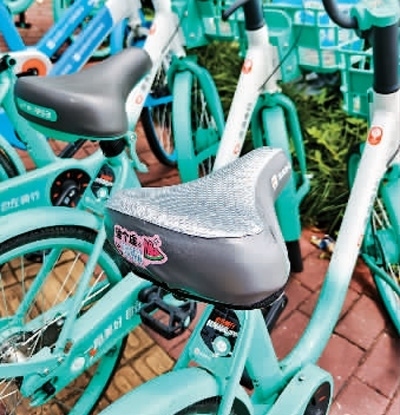 為了應(yīng)對(duì)炎熱天氣,上海街頭一些共享單車(chē)換上了“清涼坐墊”。王 初攝(人民視覺(jué))