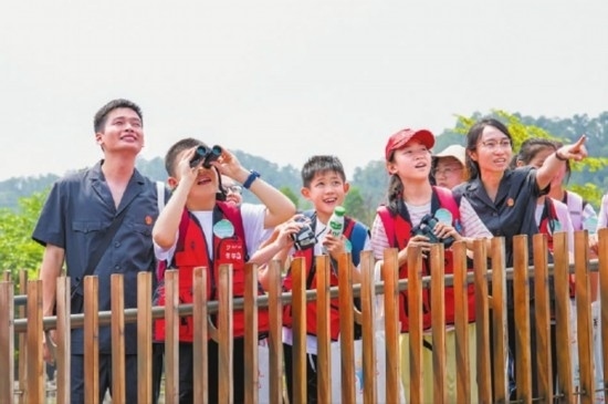 圖①:干警指引學(xué)生們觀察稀有鳥類。
