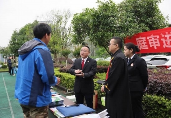 圖為重慶市渝北區(qū)人民法院在一起到企業(yè)現(xiàn)場(chǎng)開(kāi)庭的勞動(dòng)爭(zhēng)議案結(jié)束后,為勞動(dòng)者普及法律知識(shí)、提供法律咨詢。 劉霞 攝
