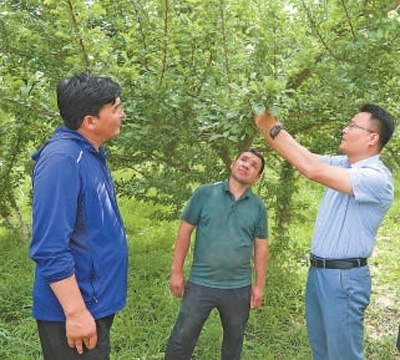 走進(jìn)居民玉素普艾力·達(dá)吾提的果園,徐學(xué)彬正與果農(nóng)交流農(nóng)業(yè)知識:“今年人工授粉,掛果挺好,但還要把防蟲、疏果、施肥放在心上,這才能保證果實(shí)的品質(zhì)?!庇袼仄瞻Αみ_(dá)吾提連連點(diǎn)頭,說:“你放心,我記著!”