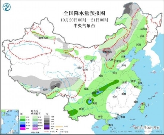 全國降水量預(yù)報(bào)圖(10月19日08時-20日08時)。圖片來源:中央氣象臺網(wǎng)站