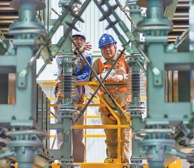 國網(wǎng)南京供電公司員工與南瑞集團工作人員在變電站查看設備狀態(tài)。杜 懿攝