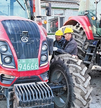 農(nóng)機庫里,社員程傳寶蹲在拖拉機旁仔細檢查,反復確認有沒有漏油,或者零件松動。