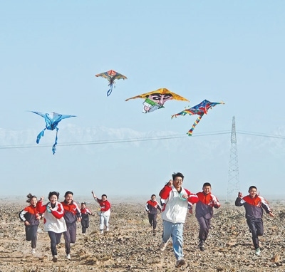 志愿者服務隊隊員帶著學生們一起放風箏。