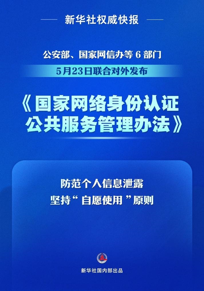 破解公民身份信息網(wǎng)絡泄露難題,加強個人信息保護。公安部、國家網(wǎng)信辦等6部門5月23日聯(lián)合對外發(fā)布《國家網(wǎng)絡身份認證公共服務管理辦法》,推進國家網(wǎng)絡身份認證公共服務建設,進一步推廣應用公共服務。