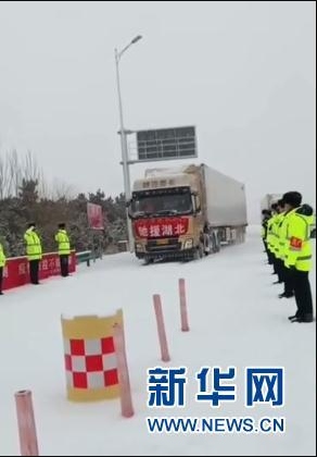 2月14日,內(nèi)蒙古多地普降大雪,從赤峰出發(fā)的運輸車輛,在當?shù)亟痪淖o送下順利踏上征途。沿途的交警列隊敬禮,目送車隊離去。