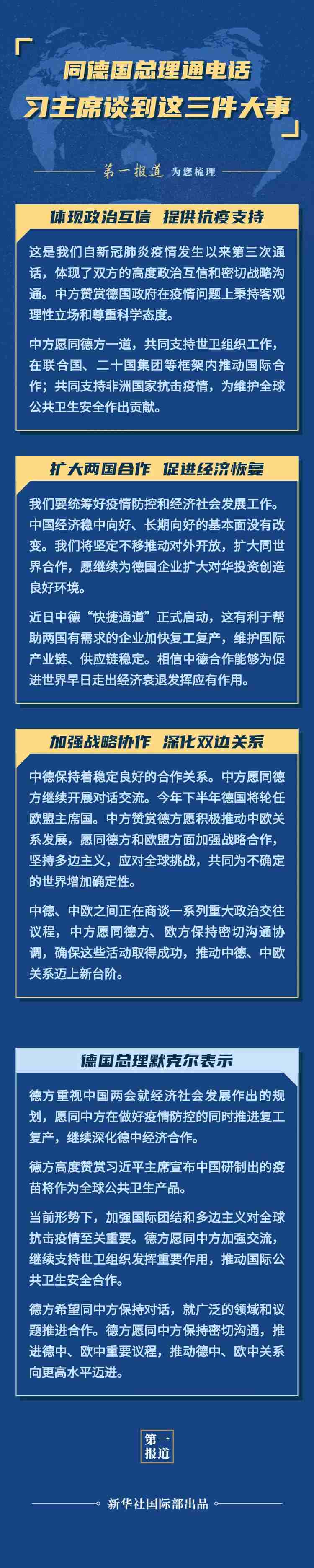 這是自新冠肺炎疫情發(fā)生以來,習主席同默克爾總理第三次通話。通話信息豐富,“第一報道”為您梳理——