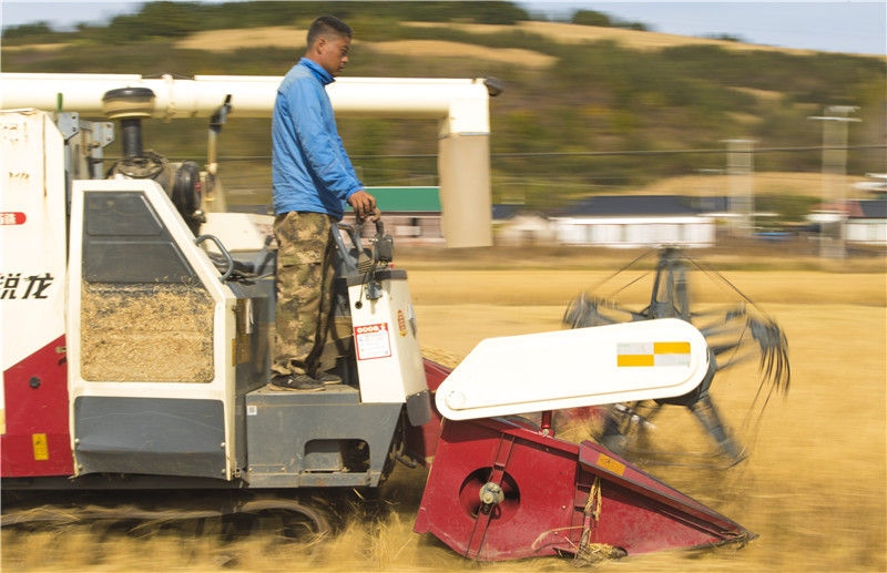 在吉林省延邊州和龍市光東村稻田里,農民駕駛收割機收獲成熟的水稻(2019年10月10日攝)。新華社記者許暢攝