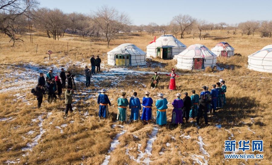 2018年11月9日,內(nèi)蒙古自治區(qū)錫林郭勒盟烏蘭牧騎隊員來到西烏珠穆沁旗烏蘭哈拉嘎蘇木新高勒嘎查的黨員中心戶恩克巴雅爾家,在戶外為周邊牧民表演節(jié)目(無人機(jī)照片)。新華社記者 彭源 攝