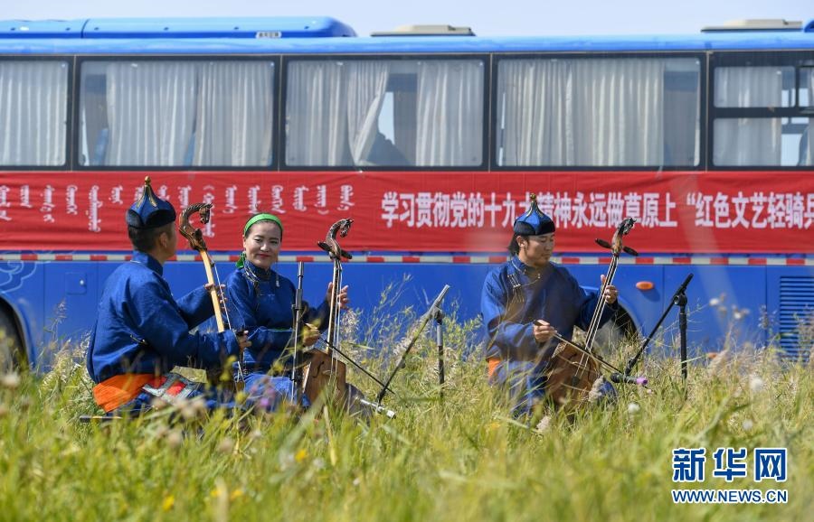 2018年9月13日,在內(nèi)蒙古自治區(qū)錫林郭勒盟鑲黃旗寶格達(dá)音高勒蘇木浩尼欽哈夏圖嘎查的一處草場,鑲黃旗烏蘭牧騎的隊員在為牧民表演文藝節(jié)目。新華社記者 彭源 攝