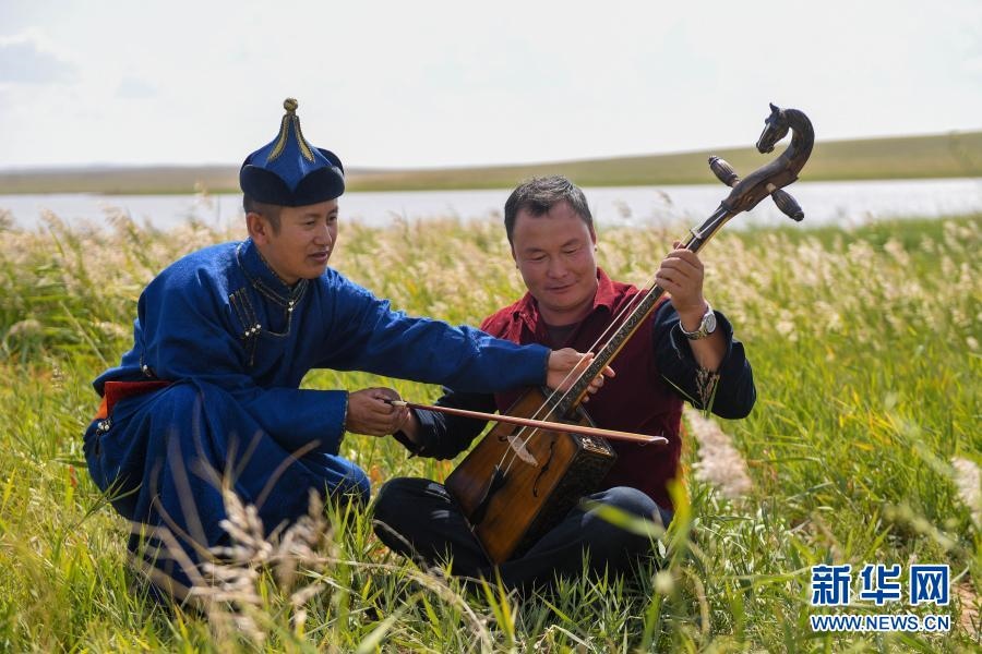 2018年9月13日,在內(nèi)蒙古自治區(qū)錫林郭勒盟鑲黃旗寶格達(dá)音高勒蘇木浩尼欽哈夏圖嘎查的一處草場,演出結(jié)束后,鑲黃旗烏蘭牧騎的隊員教牧民拉馬頭琴。新華社記者 彭源 攝
