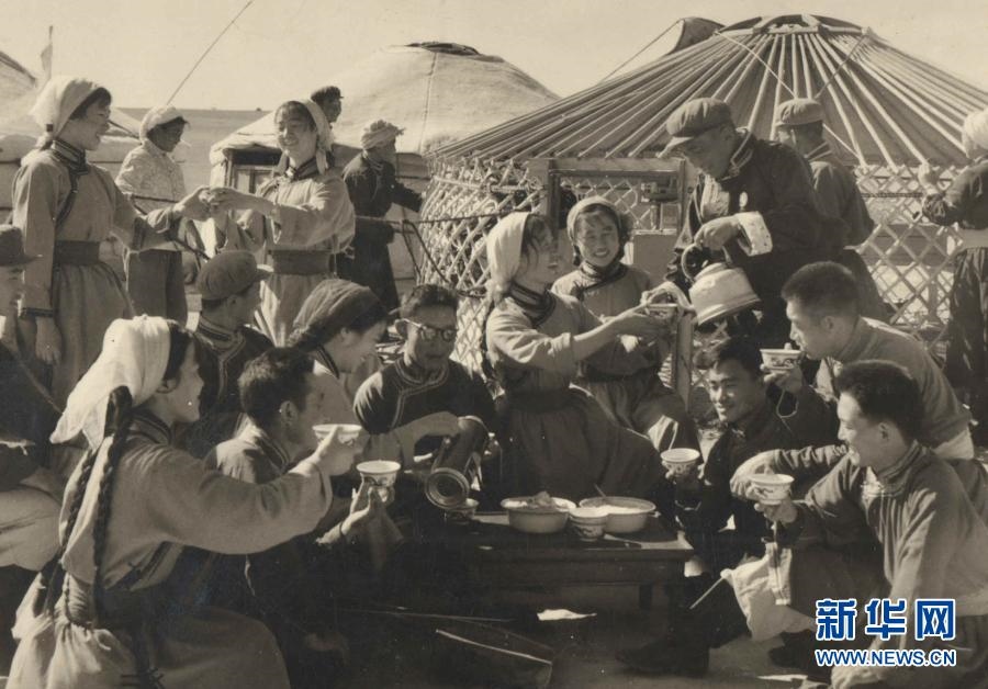 20世紀(jì)六七十年代,內(nèi)蒙古自治區(qū)錫林郭勒盟蘇尼特右旗烏蘭牧騎隊員在草原上為周邊牧民表演節(jié)目(資料照片)。新華社發(fā)