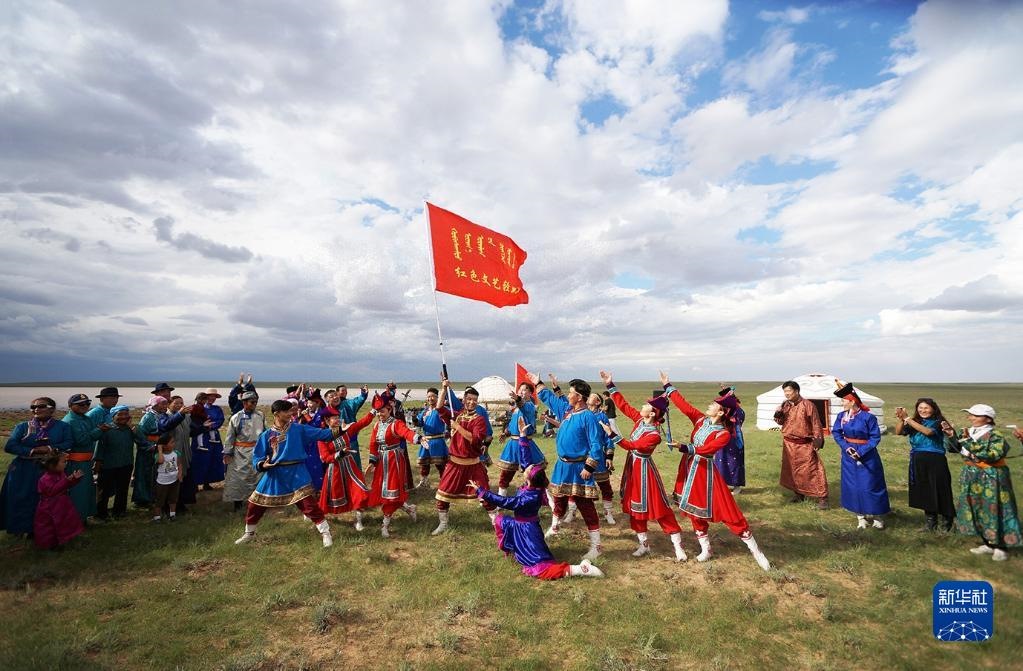 2018年8月22日,內(nèi)蒙古蘇尼特右旗烏蘭牧騎隊員在牧區(qū)演出。新華社發(fā)(東哈達/攝)