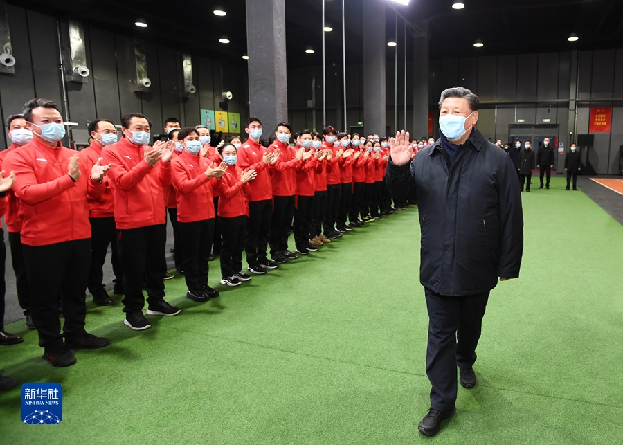 1月4日,中共中央總書記、國家主席、中央軍委主席習(xí)近平在北京考察2022年冬奧會、冬殘奧會籌辦備賽工作。這是4日下午,習(xí)近平在二七廠冰雪項(xiàng)目訓(xùn)練基地專項(xiàng)體能訓(xùn)練館,向運(yùn)動員、教練員、服務(wù)保障人員揮手致意。新華社記者 謝環(huán)馳 攝