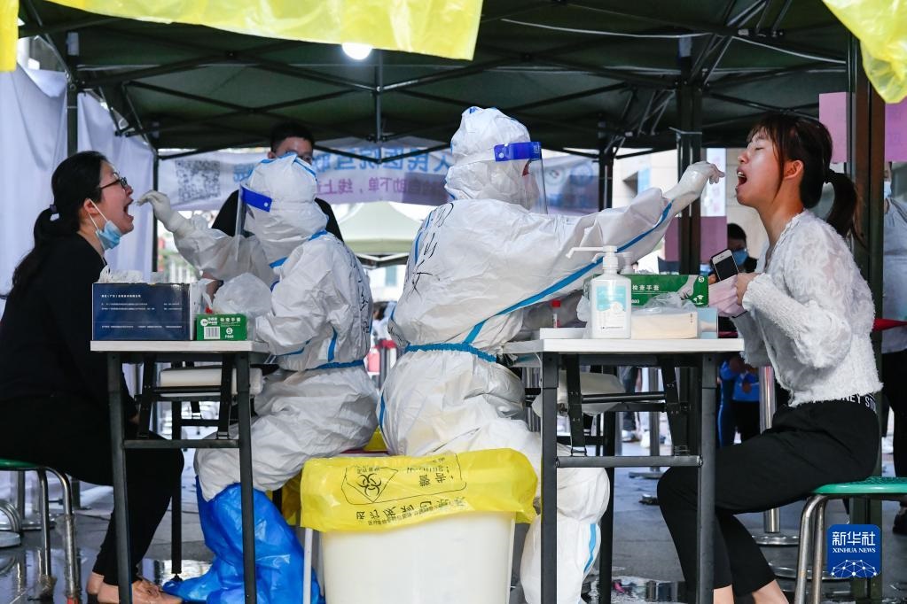 3月13日,在深圳羅湖區(qū)向西村核酸檢測點,醫(yī)務(wù)人員為居民進行核酸采樣。新華社發(fā)(儲焱攝)